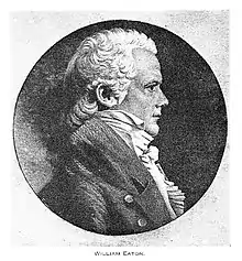 William Eaton was born in Woodstock, Connecticut. He was one of thirteen children of Nathaniel and Sarah (née Johnson) Eaton. His father was a middle class farmer, who worked as a school teacher in the winter, "an employment for which he is represented as having been well qualified by more than ordinary means for a farmer".[5] When he was ten years old, William's family moved to Mansfield, Connecticut. He ran away at the age of sixteen to enlist in the army.[6] He joined the Continental Army in 1780 and served until 1783, attaining the rank of sergeant at the age of 19.[7] He earned money for college working as a school teacher in Windsor, Vermont. In 1790, he graduated from Dartmouth College. He and a classmate presented a poetic dialogue at the commencement.[5] Between 1791 and 1792, he worked as a clerk in the lower house of the Vermont legislature[5][7]