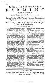 Chiltern and Vale Farming explained forms an octavo volume of 400 pages ; and treats the cropping of sour clay lands, with the common grain and leguminous plants; the natural and artificial grasses; ploughing in general; seeds; weeds; liquor for a corn steep; horse-hoeing; turnips, use and value; manures in general. The wheel-plough, with two mould-boards, is figured and largely described ; and the author seems very fond of its supposed value. The management of the works is confused; the planting of oak and fruit trees being introduced in the very middle of a book on arable lands.[2]