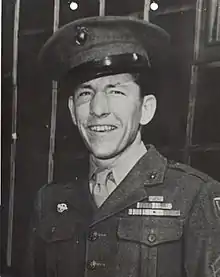 Completing his recruit training at the Marine Corps Recruit Depot San Diego, California, he was temporarily in the 1st Guard Company at that base, prior to his transfer to Headquarters and Service Company, 2nd Battalion, Camp Elliott, San Diego, California, in September 1942. He was promoted to private first class upon his arrival at Camp Elliott, and while there was later advanced to corporal.