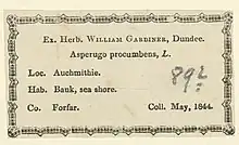 In the United Kingdom, Gardiner's specimens are cared for at the Natural History Museum in London,[3] the Royal Botanic Gardens, Kew Herbarium,[3] the Department of Biological Sciences,[3] Dundee University,[3] Hull University,[3] the Bromfield Herbarium,[3] and the Hancock Museum in Newcastle upon Tyne.[3] Elsewhere in the world, The University and Jepson Herbaria at the University of California, Berkeley,[3] the Muséum national d'Histoire naturelle[6] and the National Herbarium of Victoria, Royal Botanic Gardens Victoria also hold his specimens.[7]