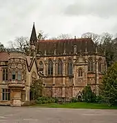 Gibbs' final addition to Tyntesfield was between 1872 and 1877, when he commissioned Arthur Blomfield to add a dramatic chapel to the north side of the house. It housed an extensive crypt, in which Gibbs intended to be buried. However, combined opposition from both the vicar of the local All Saints Church, Wraxall and the church's patrons, the Gorges family, led to the Bishop of Bath and Wells decreeing that he would not sanction the consecration of Tyntesfield's chapel, through fears that it would take power away from the local population fully into Gibb's hands. Despite this, the chapel formed a central part of life at Tyntesfield, holding twice-daily prayer meetings for the family and their guests, which after evening prayers the patriarch Gibbs in his chair bade each family member and guest goodnight in turn.[2] In praise of the resultant building, Yonge hailed the chapel as the necessary culmination of the Tyntesfield project, giving "a character to the household almost resembling that of" the Little Gidding community much idealised by 19th-century Anglo-Catholics.[2]