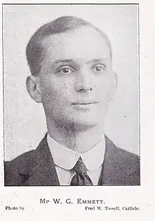 He was born in Beeston, a suburb of Nottingham, on 21 August 1887, the son of William Gidley Emmett, a lace-maker, and Annie Marie Emmett.[1] He was educated at Nottingham High School then studied natural sciences at the University of Cambridge in 1905, graduating with an MA in 1908. He specialised in explosives.