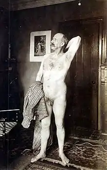 The photographs also suggest that Goldman was aware of contemporary social debates such as in the image of a nude, and possibly pregnant, woman resting her hand on John Cowan's book The Science of a New Life (1869),[24] in which Cowan argued that women should have control over their own fertility and equal rights to men.[25] Goldman's interest in the nude female form, which was difficult for him to photograph using the "respectable" women of his time as models, is obvious, as is the risk of scandal and ruin had his collection become widely known in Victorian Reading.[26]