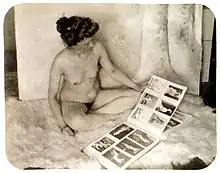 While some of the pictures appear to have been taken at Shearer's house, others include props, sets, and costumes characteristic of a professional photographic studio such as the set of images showing a crescent moon and others in which women are shown draped like Greek goddesses or praying.[13] Johnson searched archives in Pennsylvania and found no evidence that the images were distributed, nor does he believe that they were used as a catalogue for male customers as the high turnover of women in an establishment like Shearer's made that impractical. It is notable throughout how relaxed the women are in front of the camera, indicating that they were in the presence of someone they trusted, although some hide their faces.[11]