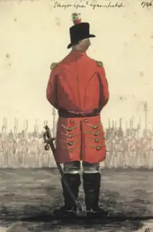 Serving with the 3rd Foot Guards in his regimental rank of lieutenant-colonel, Grinfield continued his harsh disciplinary ways. He was criticised by members of his regiment for "a most brutal and oppressive plan of discipline", with his "unprecedented martinetism" having "discontented the whole regiment".[14] At some point during this period Grinfield was on guard duty at the tiltyard in Horse Guards when he was met by a group of his creditors and sheriff's officers. Instead of agreeing to their demands Grinfield had them surrounded by soldiers and locked in the guardroom. The Lord Chief Justice of the King's Bench, Lord Kenyon, threatened him with contempt of court, at which point Grinfield surrendered to his creditors with "ignominious submission".[13]