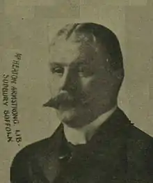 In his youth he joined the British Merchant Navy. In 1876 he joined the Turkish Navy to fight in the Russo-Turkish War. In the 1880s he got involved in the Chilean-Peruvian War assisting Chile.[4] He visited nearly all the Colonies, and travelled very extensively. His first involvement in politics came when he stood as a Conservative candidate contesting Mid-Tipperary at the General Election in 1892[5] against the separation of Ireland from England. He stood as a Loyalist in favour of granting local self-government to the greatest possible extent to Ireland. Thereafter he switched his allegiance to the Liberal Party. He was Liberal MP for the Sudbury Division of Suffolk from 1906 to 1910. He gained Sudbury from the Liberal Unionists at the 1906 General Election. He served just one parliamentary term. He did not defend his seat at the January 1910 General Election and retired from politics.[6] He then went into banking, financing railways in Jersey and British Columbia.[7] Armstrong, British Columbia was named after him.[8] He was a Fellow of the Royal Astronomical Society, Royal Zoological Society, Royal Botanic Society, Royal Statistical Society, and other learned Societies. He had published the 'Calculation of the Sun's Meridian Altitude'. He was Lord of the Manor of Roscrea.[9]