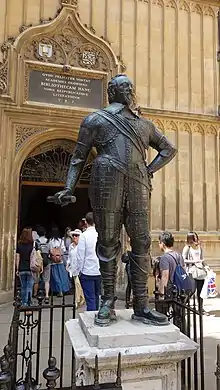 A life-size bronze standing statue of William Herbert, 3rd Earl of Pembroke, was sculpted by Hubert Le Sueur (c. 1580-1658) and stood at the family seat of Wilton House, Wiltshire. In 1723 Thomas Herbert, 8th Earl of Pembroke (1656–1733) donated the statue to the Bodleian Library at Oxford University in recognition of his office as Chancellor of the University of Oxford from 1617 until his death, for having promoted the founding of Pembroke College, Oxford and for having donated many manuscripts to the Bodleian Library in 1629. The statue was first housed in the Bodleian Picture Gallery on the third floor, but in 1950 it was moved outdoors to its present location in front of the main entrance to the Old Bodleian Library, looking east across the Schools Quadrangle. The statue is Grade II listed.[9] The square stone plinth is inscribed on two sides in Latin: