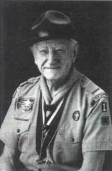 William Hillcourt (August 6, 1900 – November 9, 1992), known within the Scouting movement as "Green Bar Bill", was an influential leader in the Boy Scouts of America (BSA) organization from 1927 to 1992.[1] Hillcourt was a prolific writer and teacher in the areas of woodcraft, troop and patrol structure, and training; his written works include three editions of the BSA's official Boy Scout Handbook, with over 12.6 million copies printed, other Scouting-related books and numerous magazine articles. Hillcourt developed and promoted the American adaptation of the Wood Badge adult Scout leader training program.
