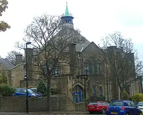 In 1907 Hale completed another commission for the Sheffield Education Committee. Lydgate Lane Council School at Crosspool was a continuation of the Arts and Crafts style used successfully at Hammerton Street, but the school was no duplicate and has a distinctive design built in gritstone from the Bole Hill or Bell Hagg quarries.[7] In 1908 Hale became involved in the design of Victoria Hall in central Sheffield. He had finished second in a competition to design the building to the firm of Waddington, Son and Dunkerley, but after the death of the original architect, William Angelo Waddington, in January 1907, Hale took over. The extent of Hale's alterations to the original plans is unclear, but the tower and its uppermost elevations were considerably changed.[8]