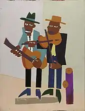 Johnson joined the WPA federal art project and with the help of Mary Beattie Brady, Johnson eventually found work as a teacher at the Harlem Community Art Center. There he and other teachers instructed about 600 students per week, as part of a local Federal Art Project supported by the Works Progress Administration. Through the center Johnson met important Harlem inhabitants such as Henry Bannarn and Gwendolyn Knight.[4]: 124 He immersed himself in African-American culture and traditions, producing paintings that were characterized by their folk art simplicity.[13] Johnson was determined to "paint his own people".[4]: 123 He celebrated African American culture and imagery in the urban settings of pieces such as Street life - Harlem, Cafe, and Street Musicians, and in the rural settings of Farm Couple at Work, Sowing, and Going to Market. Harsher realities of Negro life were depicted in Chain Gang and Moon over Harlem, which was a response to the 1943 racial riots in New York. Another series of works showed war-time soldiers and nurses.[4]: 123–180 His pieces emphasized striking and vibrant colors and simplistic figures, and his depictions of African American culture began to draw on his upbringing in the rural South. Additionally, he employed religious and political motifs throughout his work. He aimed to illustrate the richness of the African culture and the modernism of the Harlem Renaissance. The style as well as texture of the pieces demonstrated Johnson's message. In his Jitterbugs paintings, Johnson began experimenting with the relatively unused technique of screen printing, allowing for a quickness and suppleness of the painting. This layering of paint created an intentional appearance of grittiness and roughness to the image. Johnson used this technique to appeal to an aesthetic of durability and perseverance in his subjects.[14] Johnson held a solo exhibition at Alma Reed Galleries in 1941.[3] However, although he enjoyed a degree of success as an artist during the 1940s and 1950s, he was never able to achieve financial stability.[3]