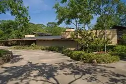 This Usonian is one of Wright's smaller designs at 1,800 square feet and is designed as a parallelogram and constructed of concrete block. Wright designed the house around a "diamond module" with 60- and 120-degree angles. The red cement floors had a diamond pattern in the same shape. The skylights were equilateral triangles, each corner 60 degrees. The pool, nestled into the wide corner of the L-shaped house, was a parallelogram with a notch out of one corner. Other interesting facets of the house include a long screened in patio (the roof of the patio is a screen as well, not a roof), a swimming pool only a few feet from the master bedroom door, an unusually shaped built-in bed in the master bedroom and triangle-shaped recessed lighting bays.