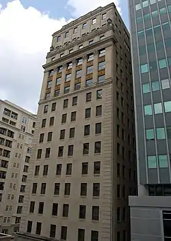 - Johnston Building, Charlotte, North Carolina (1924): It is located at 212 South Tryon Street. At 15 stories, this was Charlotte's tallest building when it opened; two more floors were added in the late 1920s. The lobby is particularly noteworthy because it runs the length of the building with marble columns, a marble staircase, and an arched, coffered ceiling. The building had been commissioned by Charles Worth Johnston (1861–1941), president of Johnston Mills Company in addition to other textile and banking interests.[40]