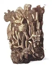 Martin did some provincial acting[3] until 1809, and he owned a quarter share in Buxton Theatre. In 1809 he published Petrifacta Derbiensia, which he dedicated to Sir Joseph Banks.[4] Petrifacta Derbiensia contained illustrations, the first in colour, which helped Martin describe the fossils and Carboniferous limestone he had studied in Derbyshire. Identification was still uncertain. The horn coral, illustrated here, was thought to possibly be from a type of undiscovered bamboo.[4]
