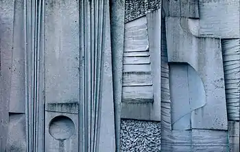 - Abstract concrete mural above the entrance to the Turnpike Centre, Leigh, Greater Manchester. (1971)[19][20]