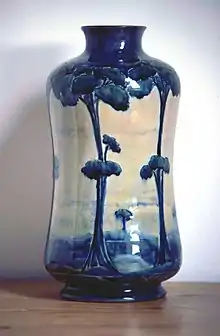 He then developed his famous Florian Ware, with heavy slip and a translucent glaze which produces brilliance of colour.[3] Florian Ware was influenced by art nouveau. It was decorated entirely by hand, with the design outlined in trailed slip using a technique known as tubelining. Florian Ware was a great success and won him a gold medal at the World's fair, the St. Louis International Exhibition in 1904. Unusually at that time, he adopted the practice of signing his name, or his initials, on nearly all the pottery he designed, the production of which he personally oversaw. In due course the extent to which his success had overshadowed Macintyre's other manufacturing activities resulted in resentment on the part of his employers, culminating in their decision in 1912 to close down his studio.