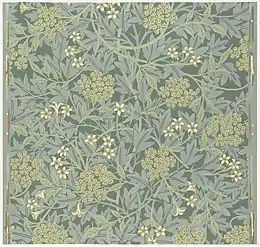 The British literary figure and designer William Morris (1834-1896), a founder of the British Arts and Crafts Movement, was especially known for his wallpaper designs. These were created for the firm he founded with his partners in 1861, Morris, Marshall, Faulkner and Company, and later for Morris and Company. He created fifty different block-printed wallpapers, all with intricate, stylised patterns based on nature, particularly upon the native flowers and plants of Britain. His wallpapers and textile designs had a major effect on British interior designs, and then upon the subsequent Art Nouveau movement in Europe and the United States.[1]