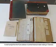 These are not personal papers but maps, pamphlets, and scrapbooks of newspaper clippings and other items of historical interest about life and government at that time. They are collectively known as The Hurst Papers, and are available in the Morris Miller Library of the University of Tasmania.[48]
