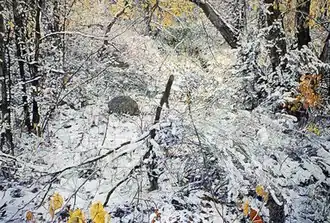 In the early 1970s, Nichols reconceived his work from scratch, turning to the landscape, and painting from nature, like the Impressionists.[25][26] His mature, painterly realist vocabulary developed intuitively and incorporated influences from Impressionism to Japanese woodblock prints and screens; inspired by photography's ability to capture fleeting qualities of light with precision and clarity, he began using it as reference to facilitate a more thorough reflection on specific, sometimes extraordinary moments or events, such as the freak, early snowstorm depicted in First Snow Santa Fe (2012).[25][26] In combination with his rapid, gestural application of paint, it enables him to achieve both the spontaneity of Impressionism and the visual believability of Photorealism.[25][1]