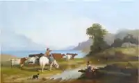 Cresswell's paintings are mostly landscape scenes in rural or even wilderness settings, animal scenes, or maritime topics showing primarily coastal scenes from the Atlantic. Especially in the latter, the influence of Stanfield—himself a noted painter of maritime scenery—has been noted by Harper. In time, the hard luminosity of his early paintings developed into a broader, more generalized handling.[11] Like Albert Bierstadt, he depicted a timeless wilderness in which light played a semi-religious role.[9] Daniel Fowler is the first artist in Canada with whom a friendship is recorded and Cresswell probably knew others such as Robert Whale.[12] In Canada, Cresswell began teaching the young Robert Ford Gagen in 1863, and thirteen years later also the then sixteen years old George Agnew Reid.[12]