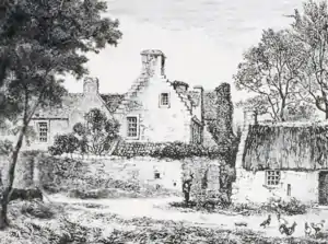Dean House was demolished in 1842 and the grounds used to create Dean Cemetery. It had been downsized in the 18th century and was by then quite modest in scale.[7] A window pediment commemorates his first marriage to Jonet Williamson, carved with "S. W. N. - D. I. W." with their heraldry. A pediment for the door of the house is inscribed; "S. W. N. - D. K. D", for Sir William Nesbit and his second wife, Dame Katherine Dick.[8] Painted vignettes from the ceiling of the long gallery were salvaged by Charles Kirkpatrick Sharpe and are now in the National Museum of Scotland and John Knox House, the subjects include Cain and Abel, Lot and his daughters, Judith, and other subjects.[9]