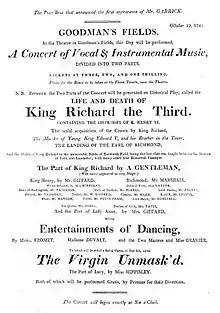 After that he played Covent Garden, the Haymarket, Lincoln's Inn Fields Theatre, Goodman's Fields Theatre, and at Richmond and Dublin. At Goodman's he played Longman in Henry Giffard's (1694–1772) play Pamela: A comedy, etc..[10][11][12]