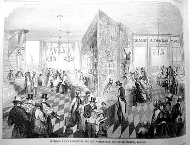 Fetridge and Company operated in Boston from 1850 through 1855.[5] In addition to publishing books on a wide variety of topics, the company also ran a retail shop that sold magazines, medical journals, law journals, and foreign news. The shop was known as the Periodical Depot or the Periodical Arcade, with entrances on both Washington Street and State Street.[nb 1]