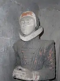 The monument to Katherine Popham (d.1588) stands adjacent to the left (north) of the monument to her husband William Pole (d.1587), and shows her kneeling surrounded by her seven children. Underneath is a tablet with the following inscription in relief: