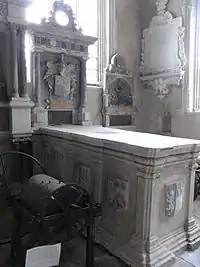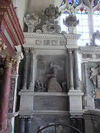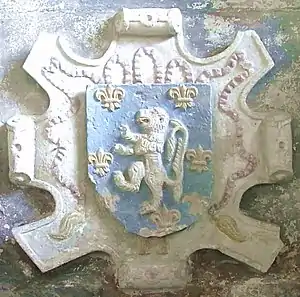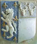 Four shields with armorials are displayed on the frieze of the monument supported by two pairs of Corinthian columns, as follows:[10]