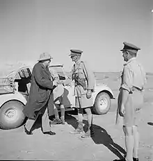 ![]() The British Prime Minister, Winston Churchill, shaking hands with Ramsden, General Officer Commanding (GOC) XXX Corps, El Alamein area, 7 August 1942. | |