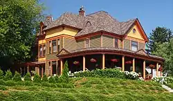 The generally rectangular form of the mansion is complicated with gables and hip roofed bays. It is generally Queen Anne in style, but has Eastlake movement millwork, an Italianate tower, and Gothic Revival details on the gables.[5] The lower levels have horizontal siding while the attic level boasts fishscale shingling. A large porch with Corinthian order columns wraps around the front of the building.[3]