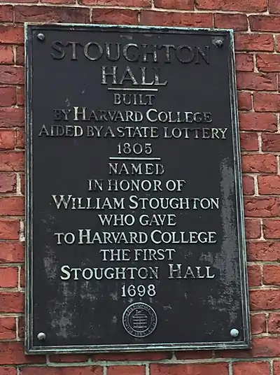 The town of Stoughton, Massachusetts is named in his honor,[2] as is one of the Harvard College dormitories in Harvard Yard. Construction of the first Stoughton Hall, in 1698, was made possible by his £1,000 gift.[54]