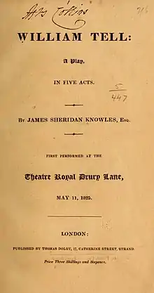 William Tell is an 1825 historical play by the Irish writer James Sheridan Knowles. It portrays the legendary 14th-century Swiss folk hero William Tell in his battle against the Habsburg authorities.[1]