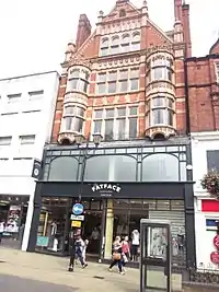 - 305/6 High Street, Lincoln. 1900, designed for Hewitt Brown & Co. (Now Fat Face). Brick with terracotta dressings-terracotta dressings were made by the Hathern Station Brick Co. of Loughborough. Flemish Renaissance Revival style. Giant pilasters, those at the angles with domed finials, enriched moulded cornice and coped gable. 4 storeys plus attics, 3 bays. Windows have terracotta mullions and transoms. Fascia with a full width glazed panel above it. Above, window flanked by single bow windows, and above that a gable has a 4-light ogee-headed window with a blind arcade and a latticed round-headed opening in the gable peak, flanked by pilasters with domed finials.