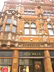 - 365-7 High Street, Lincoln. On the corner of Portland Street with the High Street and dated 1874.[26] Originally built for Messrs. Usher and Axtell. Three brick buildings with stone dressings, with shaped or Dutch Gables facing the High Street, and a larger and smaller gable facing onto Portland Street. The High Street gables have been offset to emphasise the individuality of the buildings. At the time the style would be described as ‘‘Elizabethan’’, but to-day as Jacobethan.