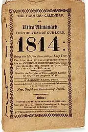 On August 11, 1814, Williams and Seward established a weekly newspaper called The Utica Club, which was commonly called The Club. Edited by Henry Goodfellow, Esq. & Company, it ran in 1814-1815. Through their newspaper they advertised for "The Philadelphia Edition of the Edinburgh Encyclopedia" ..."just received by A. Seward at his book-store, and subscriptions are to be paid and called for by subscribers."[25][26] By 1818 Williams and Seward still continued to employ their newspaper in the advertising of the various works they had published.[27] Their business continued until 1824, when their partnership dissolved with the withdrawal of Seward, but the business in all its aspects continued for several years longer under Williams.[4] Williams also published his Williams's Calendar, and Andrew Beer's Utica Almanac.[19]