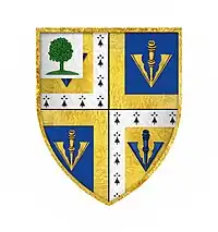 After the siege William was buried on the fortress glacis where he was slain, and a sapling oak tree was planted upon his grave. He was posthumously commended by King Henry V, and as a reward for his valiance, was granted an augmentation of honour which entitled him to have his armorial bearings "topped by a green mound and plant of oak".[1][31] This oak features in both his coat of arms and as an additional crest latterly borne by some of his wider family.[d][39][40][41][42]