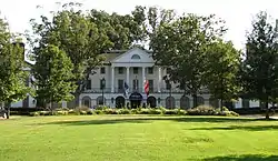 Williamsburg Inn is a historic resort hotel located at Williamsburg, Virginia. It was built in three phases between 1937 and 1972. The original section was designed by Perry Dean Rogers Architects and is dominated by a two-story portico which stands atop a ground floor arcade. It is a three-story, seven-bay, Colonial Revival style brick structure. It has two-story flanking wings in an "H"-shape. The East Wing addition, also by Perry Dean Rogers Architects, consists of multiple wings of guest rooms set at right angles to one another. A third phase embracing the Regency Dining Room and its adjoining courtyard, was completed in 1972. The Williamsburg Inn is one of the nation's finest resort hotels, internationally acclaimed for its accommodations, service and cuisine. It represented John D. Rockefeller, Jr.'s commitment to bring the message of Williamsburg to a larger audience of influential Americans.[3]