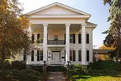 The 1910 remodeling removed the original porches and added much larger elements. Most prominent is a two-story portico with a fully pedimented gable supported by four Ionic order columns. The side entrance received a porte-cochère, while the southeast elevation gained a screened-in porch. On a small balcony over the front door is a wrought-iron balustrade with an Étoile du Nord motif that originally adorned the Alexander Ramsey House in Saint Paul, Minnesota. A one-story extension was also appended to the rear of the house.[3]