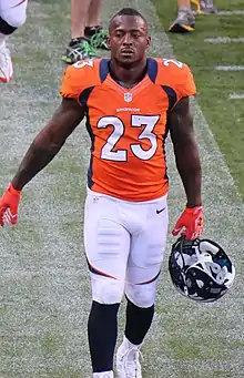 For the 2012 season, McGahee started as the number one running back on the Broncos depth chart.[89] McGahee played well, averaging 4.4 yards per carry through his first ten starts. In Week 2, against the Atlanta Falcons, he had 22 carries for 113 rushing yards and two rushing touchdowns in the 27–21 loss.[90] He had two other games with one rushing touchdowns and a rushing touchdown, in Weeks 4 and 8. McGahee suffered a season-ending injury in Week 11 in a game against the San Diego Chargers on November 18, 2012.[91][92] The injury occurred when his knee was hit by the helmet of Chargers cornerback Quentin Jammer during the second quarter of the Broncos' 30–23 win.[93] Coach John Fox initially stated that McGahee would not be placed on Injured Reserve, but on November 19, McGahee underwent an MRI that revealed a torn medial collateral ligament and compression fracture in his right knee. McGahee was placed on Injured Reserve on November 21, while the Broncos used the NFL's new "Designated for Return" label, meaning that he could potentially play in the post season.[94] He finished the 2012 season with 167 carries for 731 rushing yards and four rushing touchdowns to go along with 26 receptions for 221 receiving yards.[95]