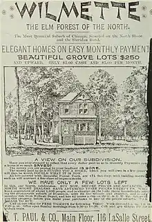 Wilmette was a forested area with high bluffs along its lakeshore.[11][12] Before European settlement, members of the Potawatomi tribe lived in the area that would later become Wilmette.[13] Native Americans were forced out of the area by treaties in the 1820s and 1830s.[11]