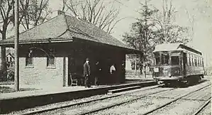 The Chicago and Milwaukee Railroad tracks were built in 1855,[11] facilitating the settlement of what would become the North Shore. Several large owners of land within the former reservation saw the opportunity to develop a community, and offered to build a station at their own expense if the railway would agree to stop in Wilmette[16] The offer was accepted, and in 1869, the Chicago and Milwaukee Railway (later the Chicago and North Western) began service to the station. The first station burned, but the second one had been finished by 1874 and is still in existence today.[11][16] This was a predecessor of today's Wilmette station.[11]