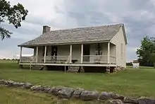 The Ray House, which is still preserved on the battlefield, dates to before the Civil War, and was used as a field hospital following the battle. General Lyon's body was brought to the Ray House by Confederate soldiers after the Union army retreated from the field. The house is open for tours during limited hours over the summer.[18] The tour loop also includes a stop at Bloody Hill, the site of heavy fighting during the battle, as well as the site of Lyon's death. The site of Lyon's death is marked with a monument, which was dedicated in 1928. Several cannons are also on display at Bloody Hill.[19]