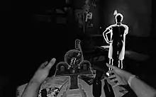 Wilson's Heart is a virtual reality horror adventure played in the first person perspective and in black and white.[2] The player must use motion controllers to interact with objects in the game world and to teleport between certain, predetermined places in the world which are indicated by ghostly images of the player character.[3] The player can open doors and drawers, pick up and manipulate certain objects and combine certain objects. The game contains a rudimentary inventory system which allows the player to store certain objects. The game will then present the objects to the player automatically when they can be used.[3]