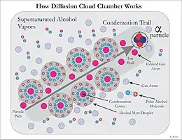 Isopropanol, methanol, or other alcohol vapor saturates the chamber. The alcohol falls as it cools down and the cold condenser provides a steep temperature gradient. The result is a supersaturated environment. As energetic charged particles pass through the gas they leave ionization trails. The alcohol vapor condenses around gaseous ion trails left behind by the ionizing particles. This occurs because alcohol and water molecules are polar, resulting in a net attractive force toward a nearby free charge (See Fig. 4). The result is a misty cloud-like formation, seen by the presence of droplets falling down to the condenser. When the tracks are emitted from a source, their point of origin can easily be determined.[5] Fig. 5 shows an example of an alpha particle from a Pb-210 pin-type source undergoing Rutherford scattering.
