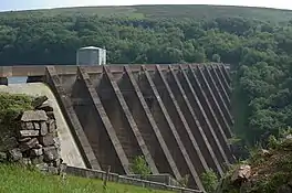 The 161 feet (49 m) high dam is of concrete buttress construction and impounds the River Haddeo to provide a water storage capacity of some 21,000 megalitres over an area of 374 acres (1.51 km2). Aggregate for the dam came from a quarry at Bampton and sand from Uffculme. These were combined to give a pinkish tinge to blend in with the local geology.