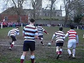 The earliest evidence of coloured shirts used to identify football teams comes from Winchester football: an image from before 1840 is entitled "The commoners have red and the college boys blue jerseys".[6] The use of coloured shirts at Winchester college is confirmed again in 1859: "Precisely at twelve o'clock, according to good old custom, the blue jerseys of college and the red of commoners mingled in the grand commencing "hot".[7] That same year, Winchester College played a match of an undefined variety of football against the Winchester Garrison Officers; 28 "goals" were scored, with 11 players on each side, leading the historian Ian Denness to suggest that the rules were a hybrid of the Winchester and Eton football games.[8]