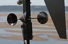 Wind direction is usually expressed in terms of the direction from which it originates. For example, a northerly wind blows from the north to the south.[7] Weather vanes pivot to indicate the direction of the wind.[8] At airports, windsocks indicate wind direction, and can also be used to estimate wind speed by the angle of hang.[9] Wind speed is measured by anemometers, most commonly using rotating cups or propellers. When a high measurement frequency is needed (such as in research applications), wind can be measured by the propagation speed of ultrasound signals or by the effect of ventilation on the resistance of a heated wire.[10] Another type of anemometer uses pitot tubes that take advantage of the pressure differential between an inner tube and an outer tube that is exposed to the wind to determine the dynamic pressure, which is then used to compute the wind speed.[11]