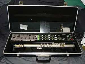 A wind controller, sometimes referred to as a wind synthesizer, is an electronic wind instrument. It is usually a MIDI controller associated with one or more music synthesizers.[1] Wind controllers are most commonly played and fingered like a woodwind instrument, usually the saxophone, with the next most common being brass fingering, particularly the trumpet. Models have been produced that play and finger like other acoustic instruments such as the recorder or the tin whistle. The most common form of wind controller uses electronic sensors to convert fingering, breath pressure, bite pressure, finger pressure, and other gesture or action information into control signals that affect musical sounds. The control signals or MIDI messages generated by the wind controller are used to control internal or external devices such as analog synthesizers or MIDI-compatible synthesizers, synth modules, softsynths, sequencers, or even non-instruments such as lighting systems.