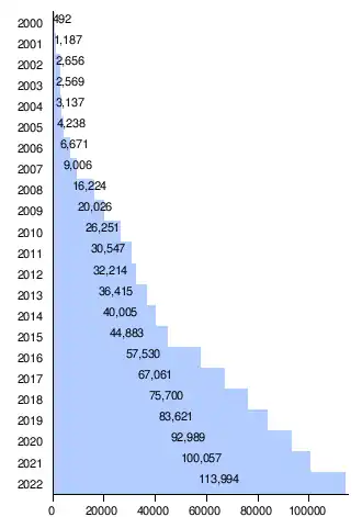 | 2022 | 113,994 | 8,808 | 8,681 | 11,010 | 12,339 | 12,718 | 10,161 | 9,236 | 6,730 | 6,340 | 8,088 | 10,190 | 9,693 |