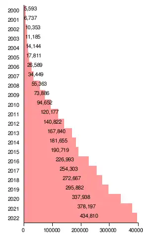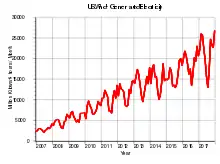 | Power from wind generated annually since 2000 (GWh)[30][31][32] |
